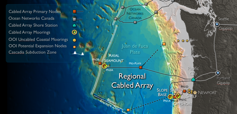 The regional cabled array is the largest component of the full OOI network that collects and shares measurements from more than 900 instruments on the seafloor and on moored and free-swimming robotic platforms. The instruments are maintained with regular, ship-based expeditions to the equipment sites. All data is freely available to users worldwide, including members of the scientific community, policy experts, decision-makers, educators and the public.