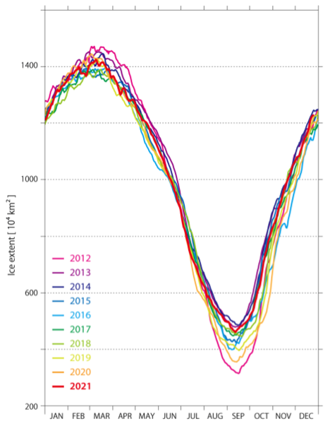 In its review of Arctic Ocean sea ice conditions during 2021, the global ice conditions forecaster Weathernews Global Ice Center found that the minimum sea ice area for the year was the largest of the past seven years at 4,610,000km2 .