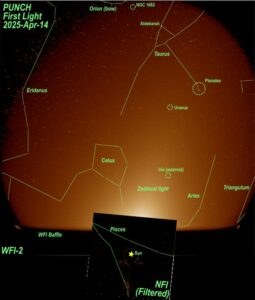 “Throughout the commissioning phase, the PUNCH team is calibrating the NFI data to remove 99% of the light to show materials streaming out from the Sun’s outer atmosphere in stunning detail,” DeForest added. “The three WFI ‘first-light’ images show star fields, but the ultimate goal is to remove the star field and other background light and preserve the faint glimmer of the solar wind as it travels to Earth.”