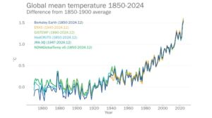In addition to 2024 setting a new record, each of the past 10 years, 2015-2024, were found to be individually the 10 warmest years on record. The record temperature in 2024 was boosted by a strong El Niño, which peaked at the start of the year. In every month between June 2023 and December 2024, monthly average global temperatures exceeded all monthly records prior to 2023. Record levels of greenhouse gases were the primary driver, with the shift to El Niño playing a lesser role.