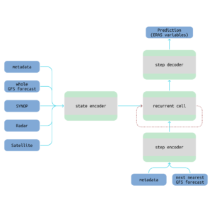 As the starting point, AIREN-NWP uses global forecast system (GFS) forecasts for the Central Europe area. These forecasts are issued four times daily at six-hour intervals, with a 0.25° spatial and three-hour temporal resolution. ERA5 reanalysis serves as the ground truth, matching the spatial resolution but providing hourly data. To achieve this one-hour output resolution, for each recurrent step, we combine the next nearest three-hour GFS forecast with metadata reflecting how far into the future the current prediction is. We currently focus on three target variables and predict them separately – accumulated precipitation (APCP), temperature 2m above the surface (TMP) and velocity of wind gusts (GUST).