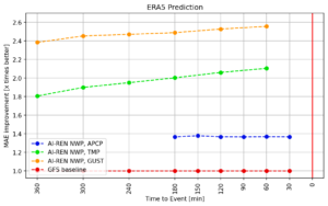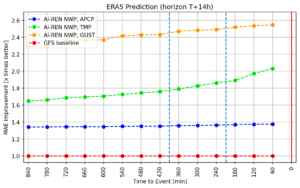 We have created three models, one for each target variable, with performance summarized in the following plot. Precipitation (APCP) is predicted three hours into the future, and the model is updated every 30 minutes, achieving up to 1.4x lower MAE than that of the GFS. The temperature (TMP) and wind gusts (GUST) are predicted six hours into the future, with the model updated every 60 minutes. They are respectively achieving up to 2.1x and 2.5x improvement in MAE, and the improvement is increasing toward the event.