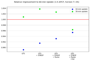 AIREN-NWP has the potential to rapidly update its predictions due to the availability of real-time data sources like radar and satellite measurements. To explore this capability, we tested different update frequencies for precipitation (APCP) predictions, precisely 10, 30 and 60 minutes. The achieved errors are very close, within a 1% margin of the base 60-minute updates, with the 10-minute updates falling slightly behind. As a result, the 30-minute update interval frequency is optimal for the current generation of AIREN-NWP models.