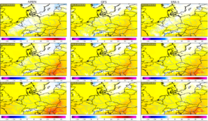 The AIREN-NWP forecast is similar to the ERA5 reanalysis, with the only major mistake of predicting higher temperatures in southern Poland at 12 UTC. AIREN-NWP correctly lowered the temperatures of the input GFS forecast in the area over Germany and France and increased temperatures in Hungary, closing the gap to the ERA5.