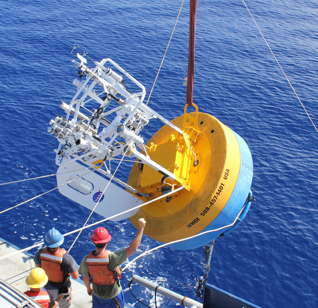 The buoys sit on the surface of the ocean and are transported via near-surface ocean currents to measure the water temperature a few centimeters beneath the surface to calibrate corresponding satellite measurements.