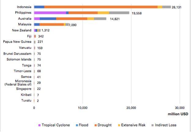 The average annual loss (AAL) from extreme weather events across the Southwest Pacific is estimated to be US$28.1bn in Indonesia, US$19.6bn in the Philippines, US$14.8bn in Australia and US$7.1bn in Malaysia. As the report considered the size of the economy, it found that the estimated AAL is as high as 17.9% of GDP for Vanuatu, 14.6% of GDP for Tonga and 7.7% of GDP for the Federated States of Micronesia.