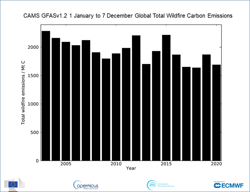 While fire activity in southern tropical Africa has been very low this year, there has been enhanced activity in areas such as Siberia, Colorado, California and the Pantanal region of southern Brazil. In 2020, approximately 1,690 megatonnes of carbon have been discharged into the atmosphere from January 1 to December 7, 2020. This compares to 1,870 megatonnes of carbon emitted in 2019 and continues the pattern of lower emissions.