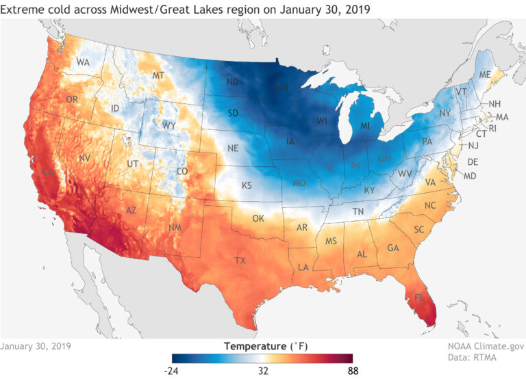 Image: A map of daytime high temperatures on January 30, 2019, based on NOAA Real-Time Mesoscale Analysis (RTMA) data. The cold wave that struck the US Midwest and eastern Canada in late January 2019 killed more than 20 people and produced the coldest temperatures in more than 20 years over much of the region. (Map by NOAA Climate.gov, based on RTMA data provided by Steve Levine/NCEP)