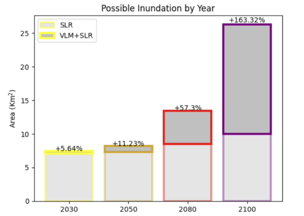 The team used data and models to project coastal flooding down to the millimeter resolution in some places, and they made predictions with and without vertical land motion included. By projecting current vertical land motion into the future, the authors could narrow down which areas of the city may be at greater risk of flooding, and emergency managers could alert residents early.