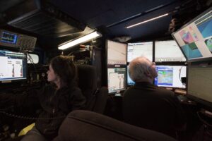 University of Colorado Boulder’s Robust Autonomous Airborne Vehicle – Endurant and Nimble (RAAVEN) aircraft system that will fly behind storms and record as much footage of the hail swath as possible. Credit: Brian ArgrowDoppler on Wheels in a supercell storm in Oklahoma. Credit: Jen WaltonPenn State’s NARHWAL (Novel Atmospheric Research on High-impact Weather Applications Laboratory) will deploy as part of ICECHIP. In addition to various instrumentation, it has mobile hail storage and an analysis lab. Credit: Kelly LombardoKaren Kosiba and Josh Wurman inside one of the Doppler on Wheels trucks. Credit: Flexible Array of Radars and Mesonets (FARM)3D-printed replica of 7in hailstone that fell in Aurora, Nebraska, on June 22, 2003. Credit: Becky Adams-Selin