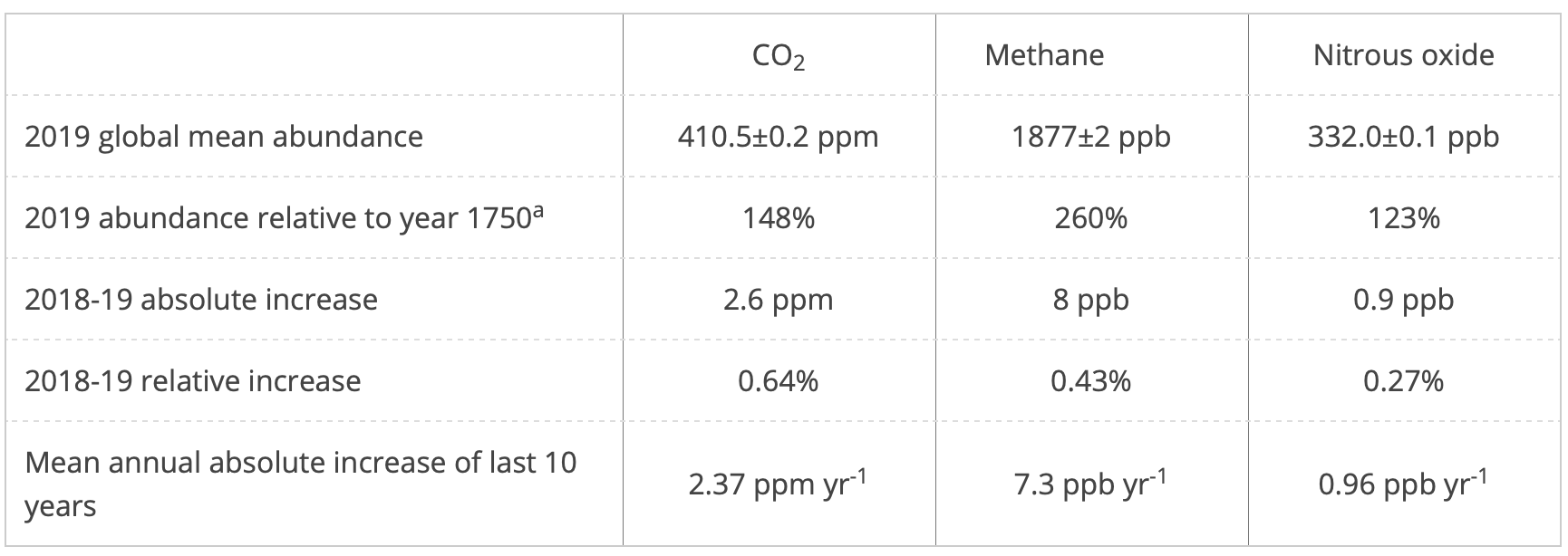 Methane, a powerful greenhouse gas which remains in the atmosphere for less than a decade, was 260% of pre-industrial levels in 2019 at 1,877 parts per billion. The increase from 2018 to 2019 was slightly lower than that observed from 2017 to 2018 but still higher than the average over the last decade.