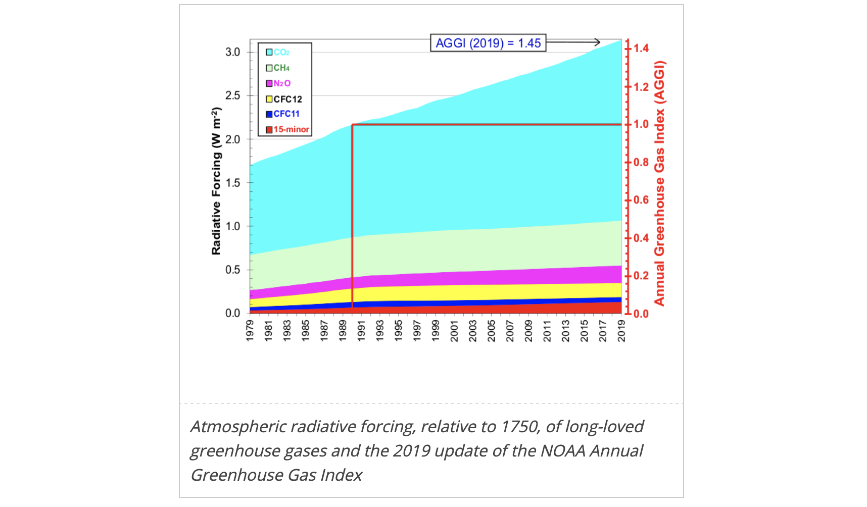 Carbon dioxide is the single most important long-lived greenhouse gas in the atmosphere related to human activities, contributing about two thirds of the radiative forcing. The annual globally averaged level of carbon dioxide was about 410.5ppm in 2019, up from 407.9ppm in 2018, having crossed the 400 ppm benchmark in 2015. The increase in CO2 from 2018 to 2019 was larger than that observed from 2017 to 2018 and also larger than the average over the last decade.
