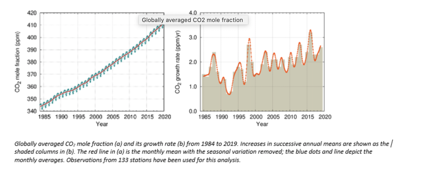 The Greenhouse Gas Bulletin is based on global average figures for 2019. Individual stations have shown that the upward trend continues in 2020. Monthly average CO2 concentrations at the benchmark station of Mauna Loa, Hawaii, were 411.29ppm in September 2020, up from 408.54ppm in September 2019. At Cape Grim in Tasmania (Australia), the respective figures were 410.8ppm in September 2020, up from 408.58ppm in 2019.